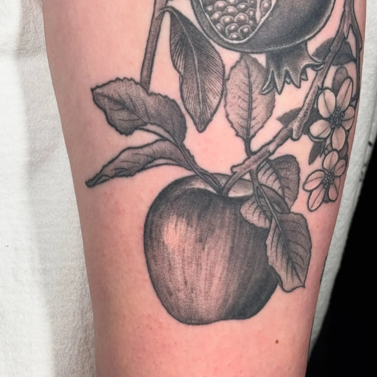 #apple #pomegranate #blackwork #southcarolina #ladytattooer